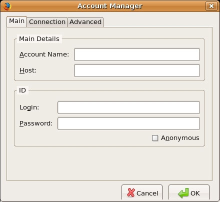 کلید "Create an Account" فقط برای اولین مرتبه ای که شما می خواهید در FireFTPبرای خود حساب باز کنید ، ظاهر می شود. پس از آنکه بر روی کلید مذکور کلیک کردید ، پنجره ای با کادرهای خالی متعدد مانند زیر ظاهر می شود: