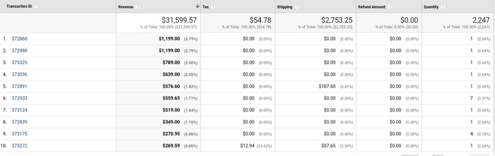 در مثال فوق ، 20 معامله تکراری به Google Analytics گزارش شد: 845 در گزارش بررسی و 825 در گزارش عملکرد فروش. در تجربه من این تفاوت نسبتا کوچک (2.4 درصد) است و اگر خیلی بالاتر ازین است ، اقدام کنید. معاملات تکراری زمانی رخ می دهد که کسی بیش از یک بار از صفحه تایید سفارش بازدید می کند. مسدود کردن این معاملات نیاز به تخصص فنی مثل یک دستیار تایید شده گوگل آنالیتیک دارد.