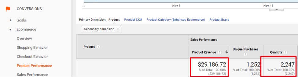 گزارش عملکرد محصول در منوی Conversions > Ecommerce Product Performance است که اطلاعات مفیدی در مورد فروش محصول ، درآمد محصول ، میزان فروش و موارد دیگر ارائه می دهد. میزان سبد خرید به صورت دقیق و قیمت خرید به صورت دقیق (بالا سمت راست) به ویژه مفید است.