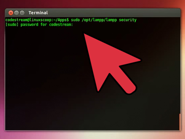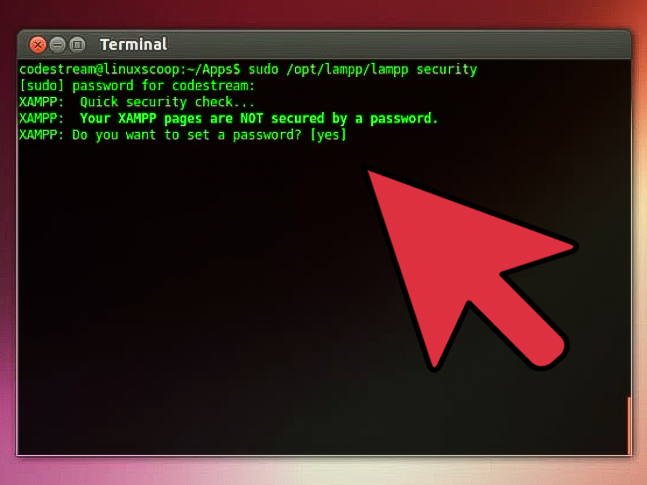 شما می توانید XAMPP را با استفاده از ترمینال با وارد کردن فرمان زیر و فشار دادن Enter باز کنید.