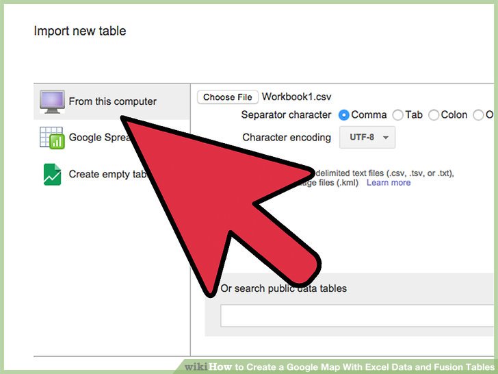 در این پنجره ، گزینه هایی برای آپلود فایل دارید. "From This Computer" را انتخاب کنید و سپس روی دکمه "Choose File" کلیک کنید. این به شما این امکان را می دهد تا از طریق رایانه خود فایل را انتخاب کنید. address.csv (یا هر فایل دیگری که مایلید از CSV استفاده کنید) برای بارگیری در سایت جداول فیوژن را انتخاب کنید. پس از انتخاب آن ، روی دکمه « Next» در گوشه پایین سمت راست کلیک کنید.